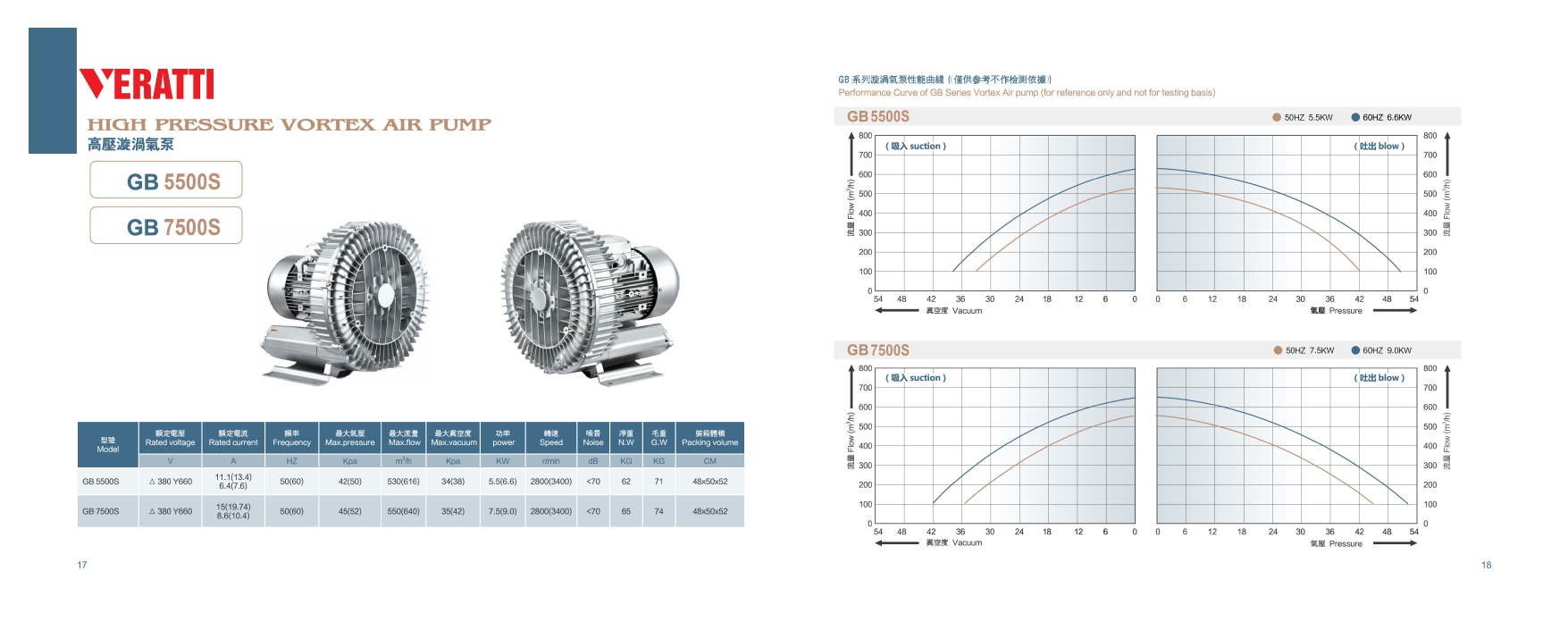 Máy thổi khí con sò Veratti GB-5500S công suất 5.5Kw – điện áp 380v 3pha . Lưu lượng tối đa Qmax = 530m3/h , áp tối đa 42KPA